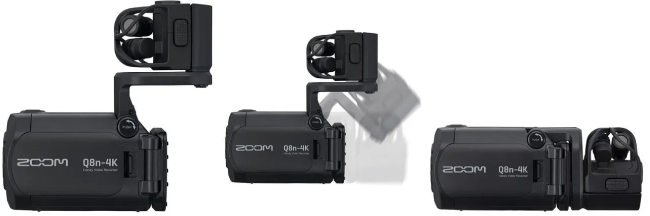 يمكن طي وحدات الصوت للخلف لتوفير مساحة أثناء النقل. يوجد في الجزء الخلفي من كاميرا Q8n-4K شاشة LCD مقاس 2 بوصة يمكن قلبها 180 درجة لالتقاط سيلفي.